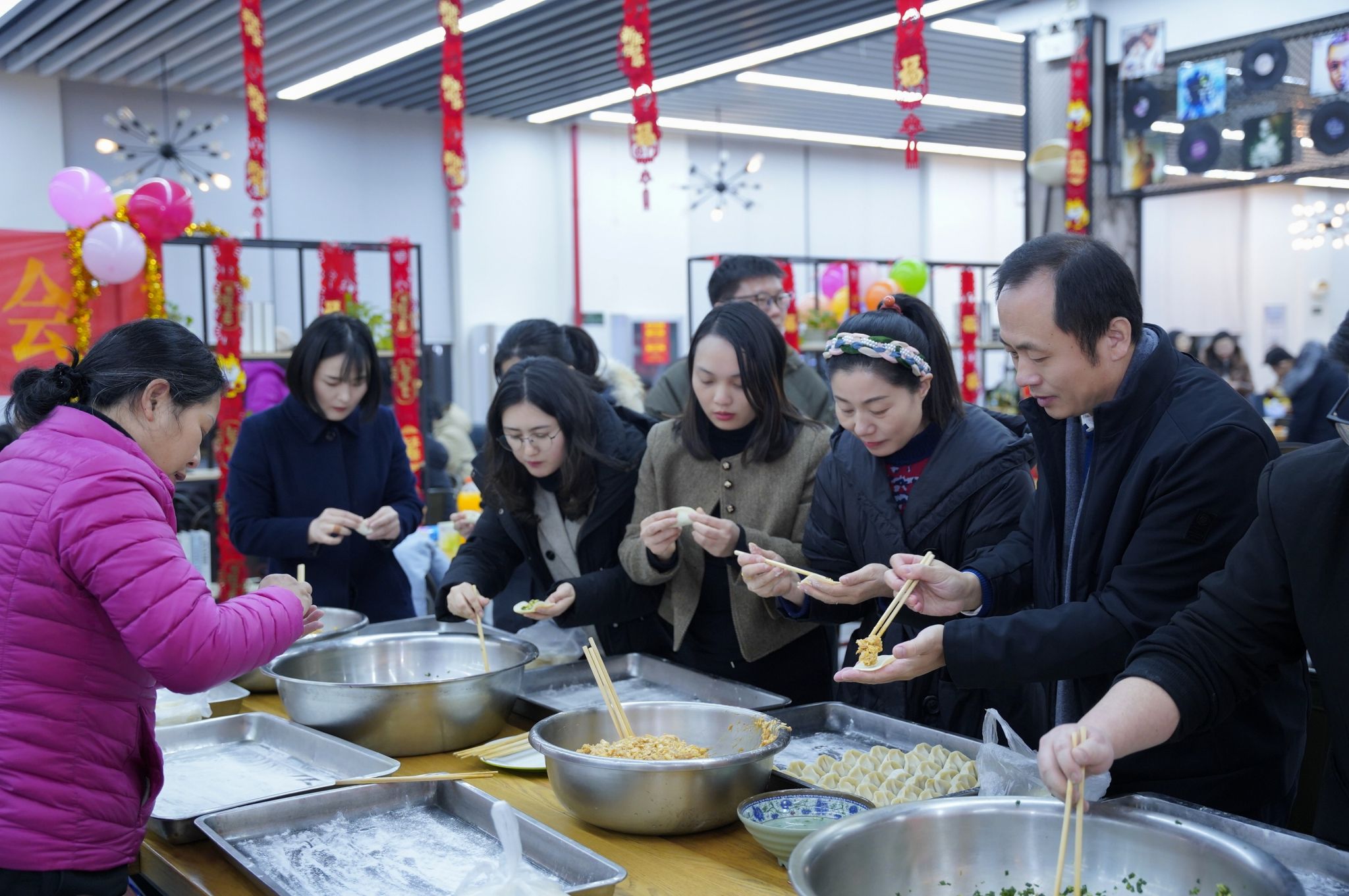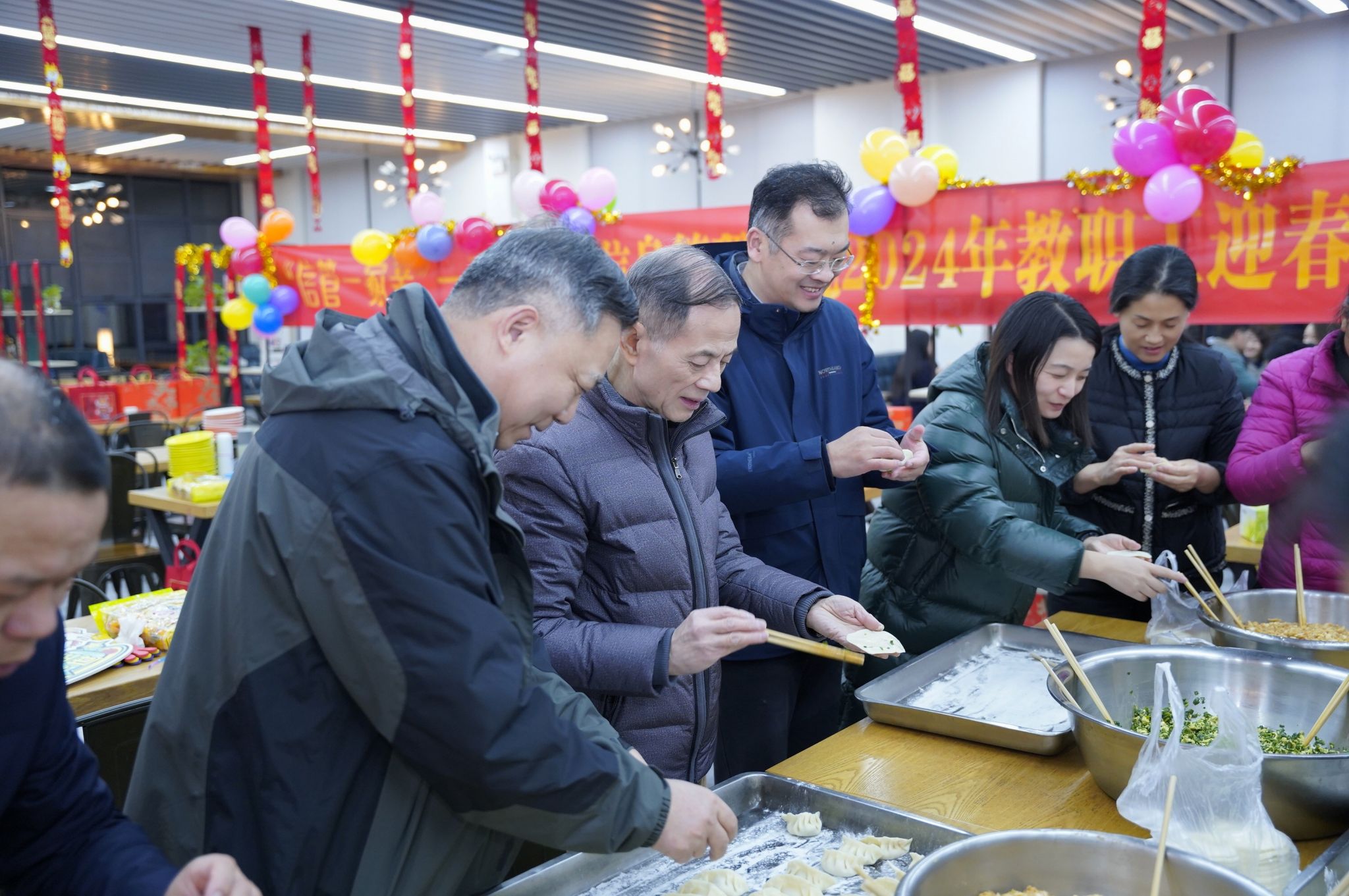 晚上6时许,枫园食堂一片喜气洋洋,五彩气球、红色横幅、新年展板,预示着这里将是充满欢乐祥和氛围的“第一现场”。老师们陆续到来,签到、领取伴手礼,或结伴就坐或互相招呼着“升级掼蛋”,最热闹的是“包饺子比拼”,面皮儿包裹着不同馅料,在老师们手中变化出各种形态,一排排整齐摆放的饺子展示着老师们工作之外的心灵手巧。